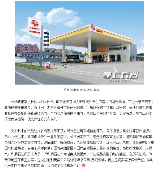 近幾日,湖南部分市州已迅速采取“壓非保民”措施,停止了眾多商家及出租車的燃?xì)夤?yīng)。突如其來的氣荒讓大家措手不及。為了確保市場(chǎng)供油穩(wěn)定,讓星城人民溫暖過冬,順暢出行,和順石油積極應(yīng)對(duì),從山東緊急采購(gòu)2萬噸國(guó)VI標(biāo)準(zhǔn)柴油,專門用于市場(chǎng)保供,切實(shí)履行企業(yè)社會(huì)責(zé)任,同時(shí)以優(yōu)惠價(jià)格供應(yīng)市場(chǎng),絕不借機(jī)漲價(jià)。